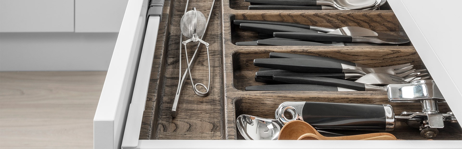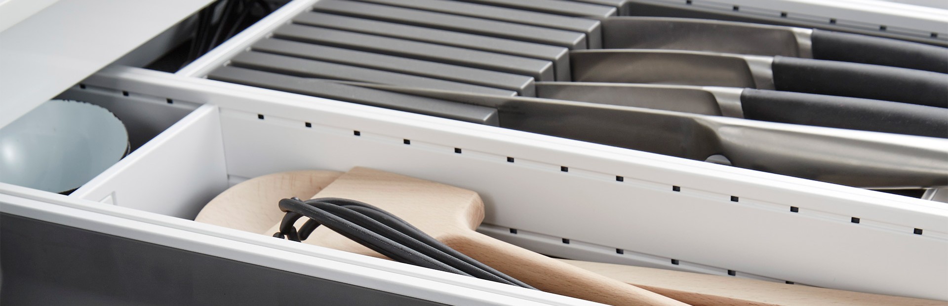 Legra Box-skuffen kan velges med hvite, svarte og rustfri sider, og sammen med tilbehøret Ambria Line gjør skuffene den innvendige delen av kjøkkenet til en opplevelse i seg selv.