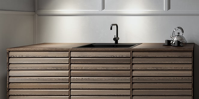 MASSIV RAW stjeler ofte bildet i rommet med sitt mørke, naturlige uttrykk – et eksklusivt møbeluttrykk med en ergonomisk gripeliste i hver lamell.