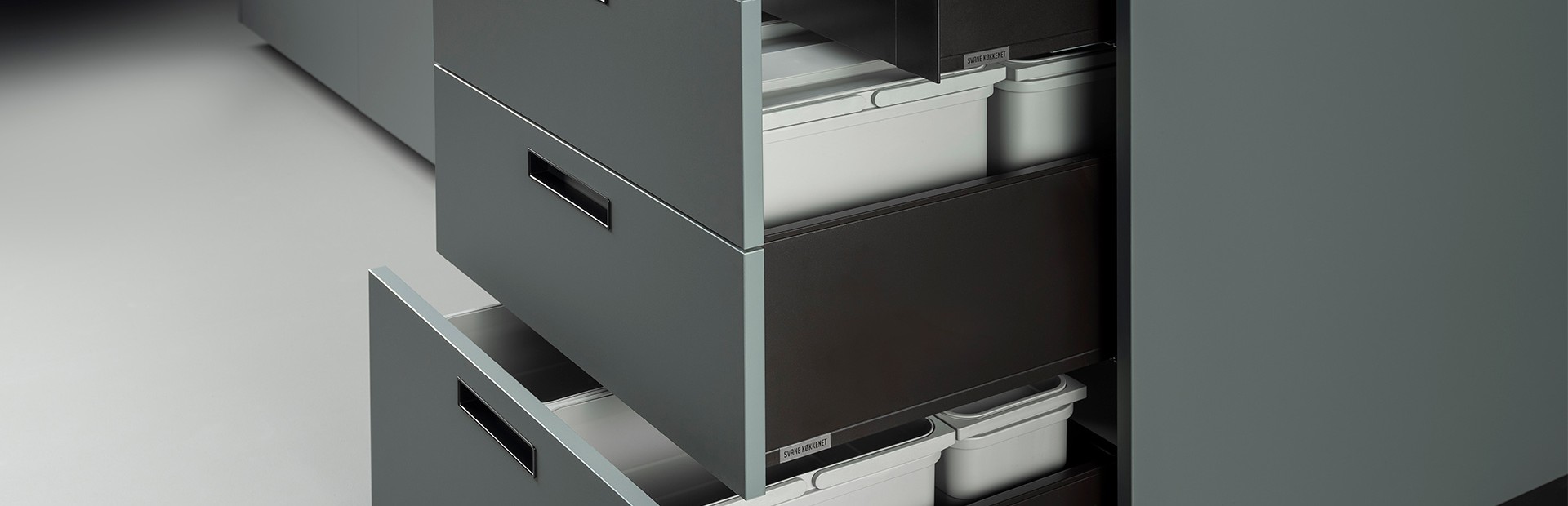 Hos Svane Kjøkkenet finner du flere funksjonelle løsninger for resirkulering og avfallssortering – med vår nye underskapshøyde på 832 mm (BU 1726) kan du få så mange som 10 avfallsbeholdere i ett element laget spesielt for optimal sortering.